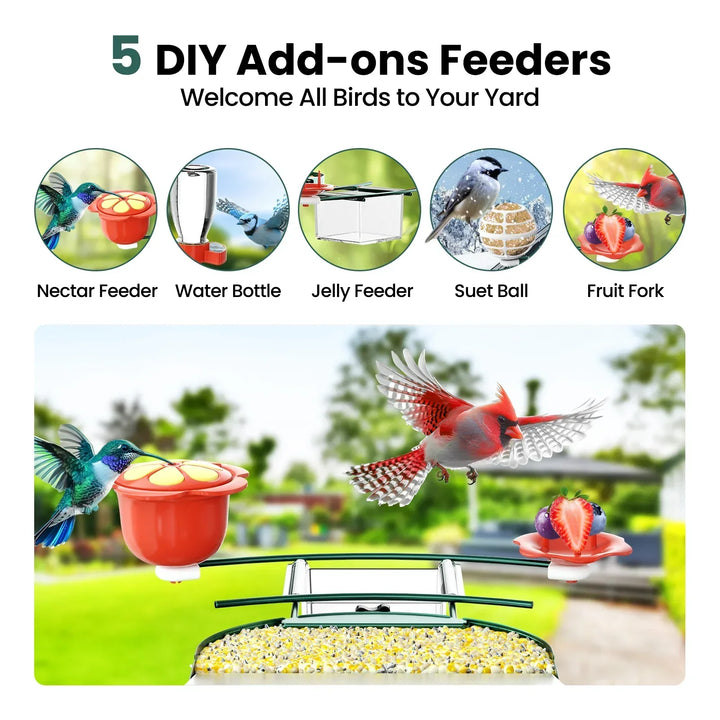 Create a warm, welcoming space for creatures big and small. With five included add-on accessories, you can offer different foods like nuts, seeds, and fresh fruit. Attract a beautiful array of visitors and watch your outdoor area come alive with activity and color every day.